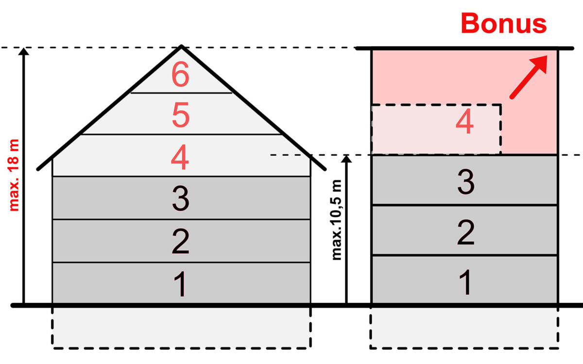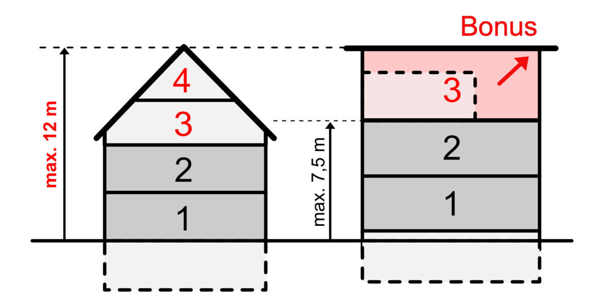 Durch einen solchen Stockwerk-Bonus würde aus 2-geschossig kurzerhand 3-geschossig (mit 12 Metern Maximalhöhe) und bei Häusern mit Giebeldach wären ganze 4 Stockwerke möglich (2 Vollgeschosse plus 2 Dachgeschosse).